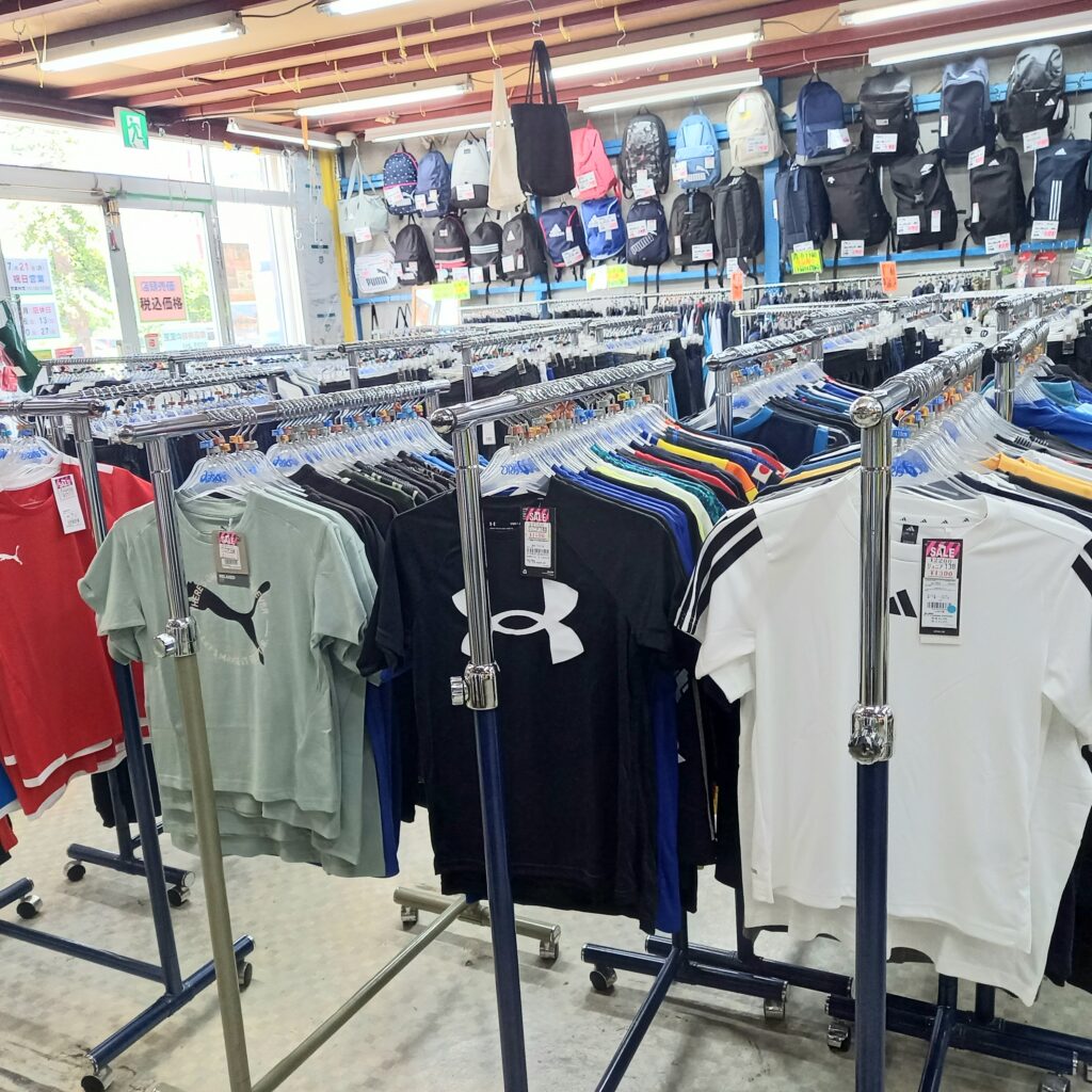 店舗では半袖シャツ、ハーフパンツ、シューズ、バッグなどを